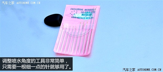 调整喷水角度的工具非常简单,只需要一根细一点的针就够用了。我们先尝试着喷出玻璃水,查看水柱是否在合理的区域内,若不合适,则找到喷水口的位置,用事先准备好的针插入喷水口中进行微调。
