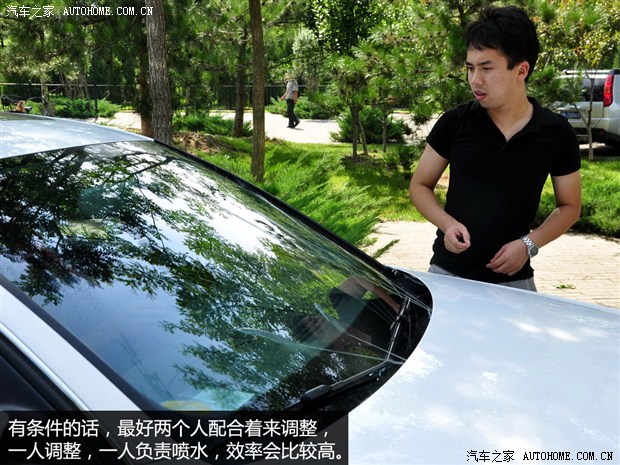 每调整一次我们要尝试着喷水,看看变化,所以这个过程可能比较费玻璃水,所以自己动手调整前建议至少准备一桶新的玻璃水备用,并且有条件的话可以考虑两个人配合操作,一人调整一人喷水可能比较高效一些。