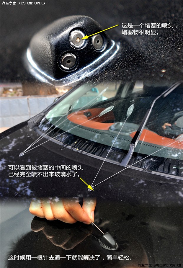 由于玻璃水喷口很细小,所以水垢、灰尘都有可能堵住它,因此定期清洗很重要。